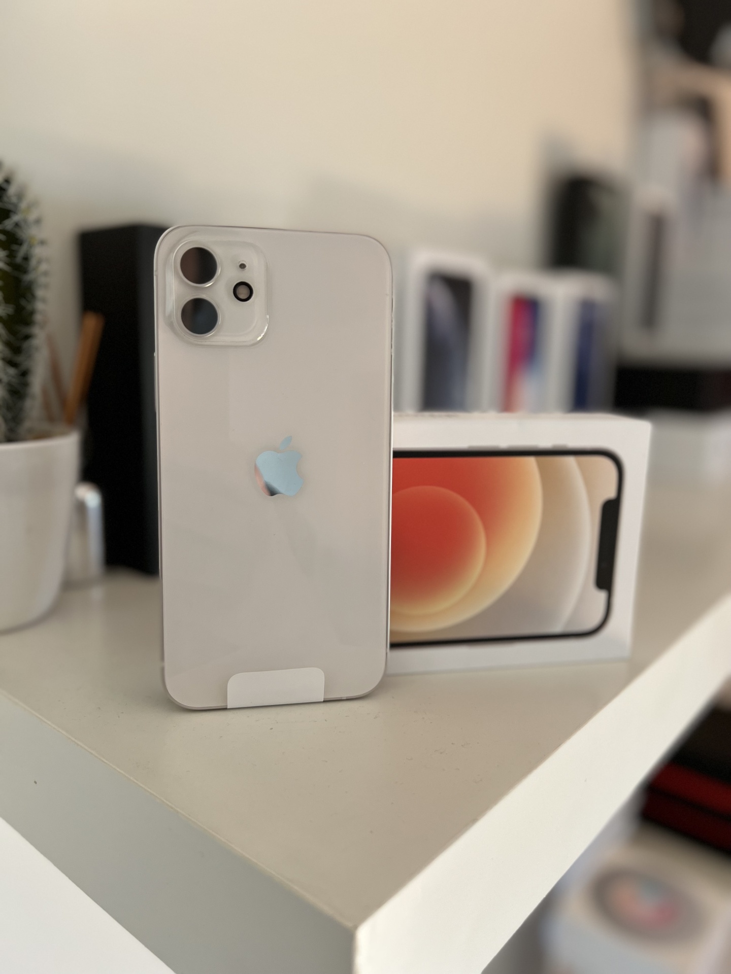 • iPhone branco com duas câmaras traseiras junto à caixa do iPhone sobre superfície branca