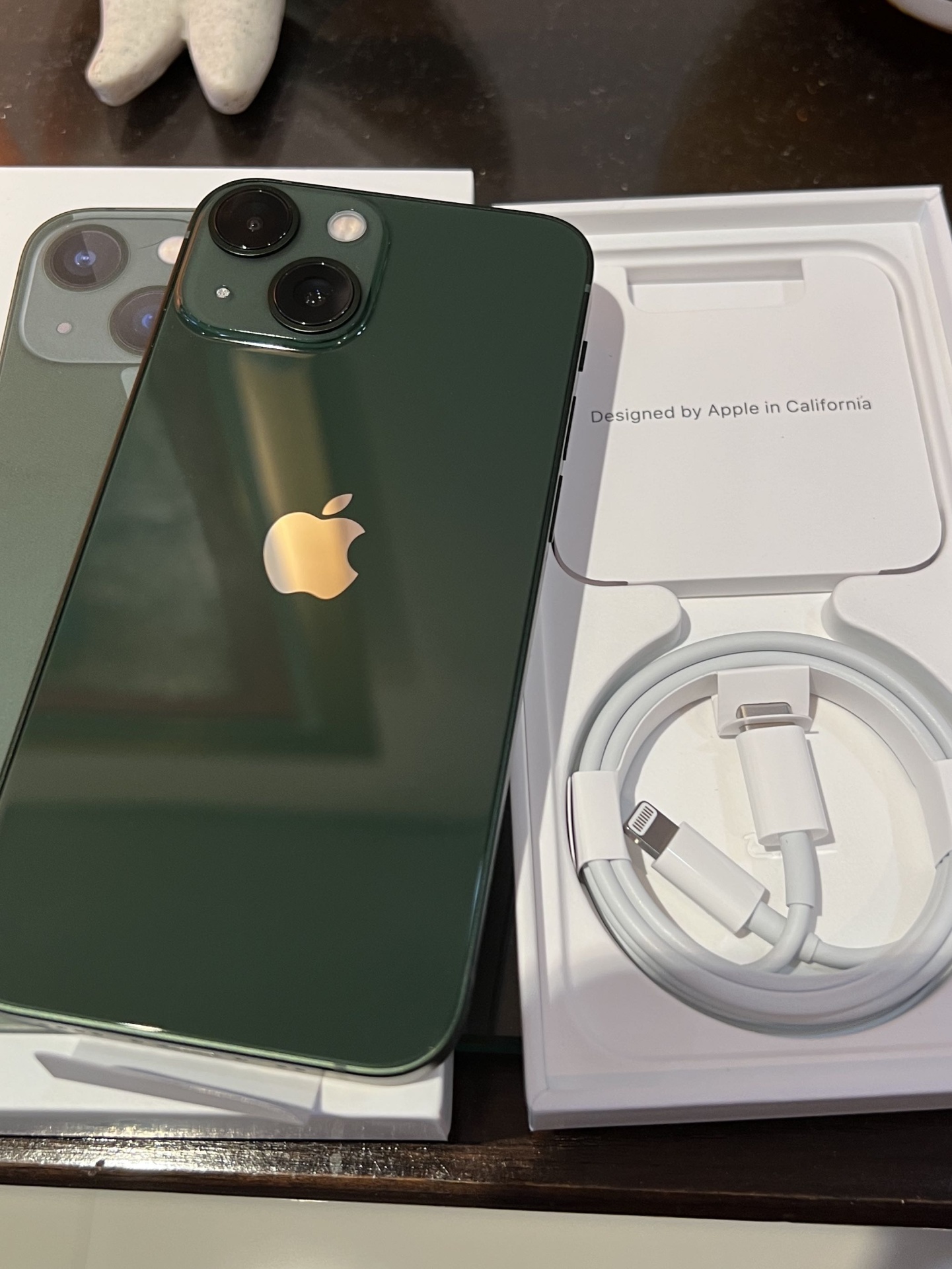 • Smartphone Apple iPhone verde com duas câmaras atrás sobre caixa aberta com cabo branco