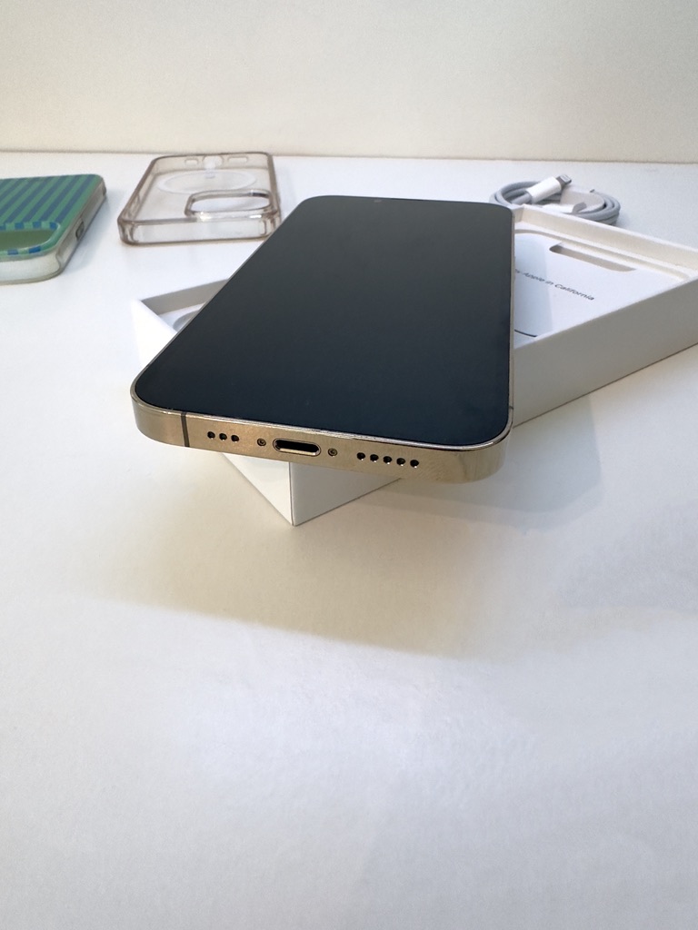 • Smartphone preto com bordas douradas sobre caixa branca, cabo e capas ao fundo