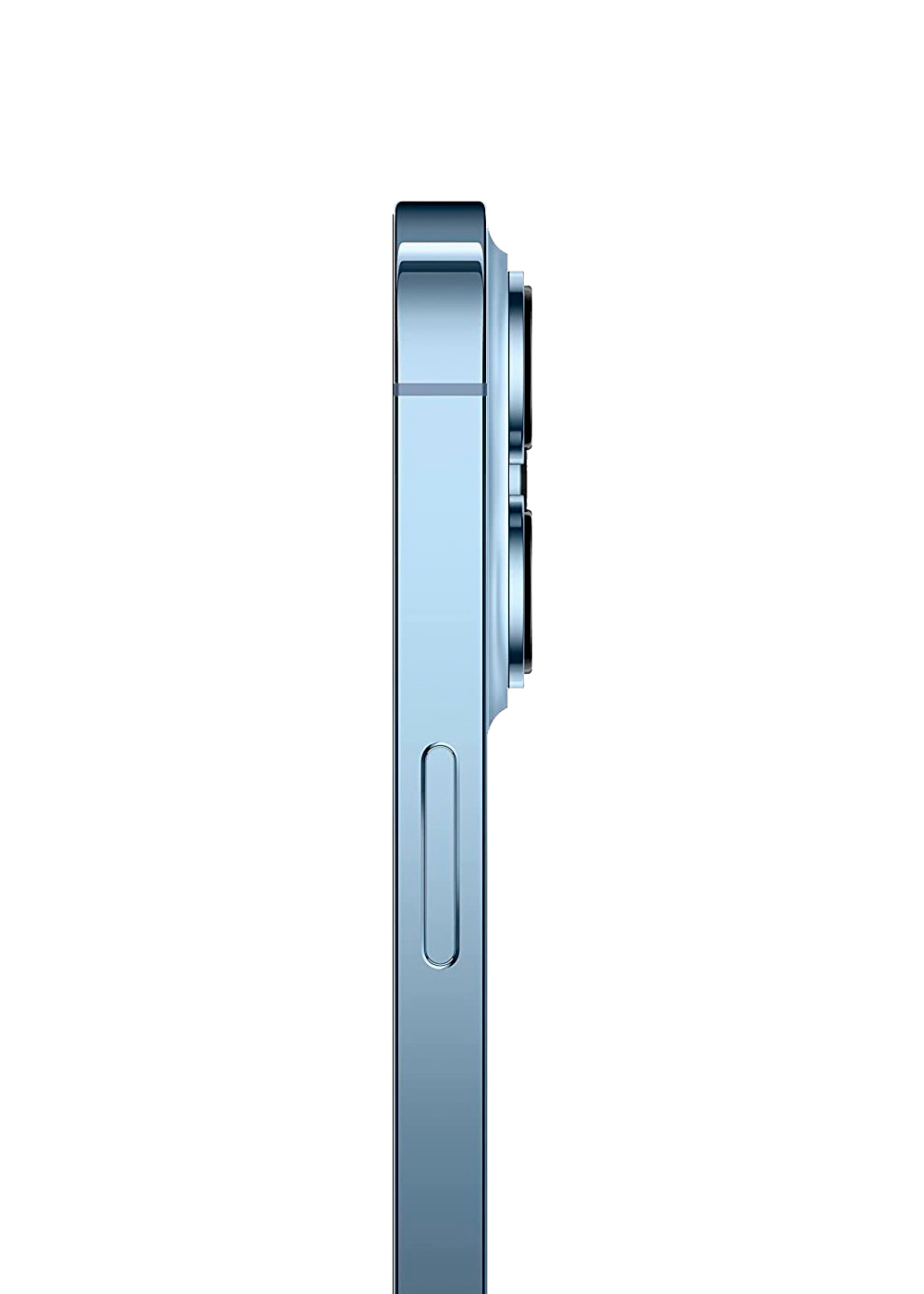 • Vista lateral de telemóvel azul claro com câmara dupla e botão de controlo
