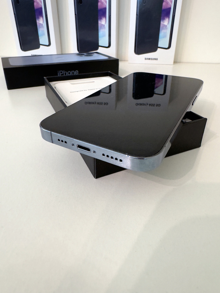 • Smartphone preto sobre caixa iPhone com caixas Samsung ao fundo