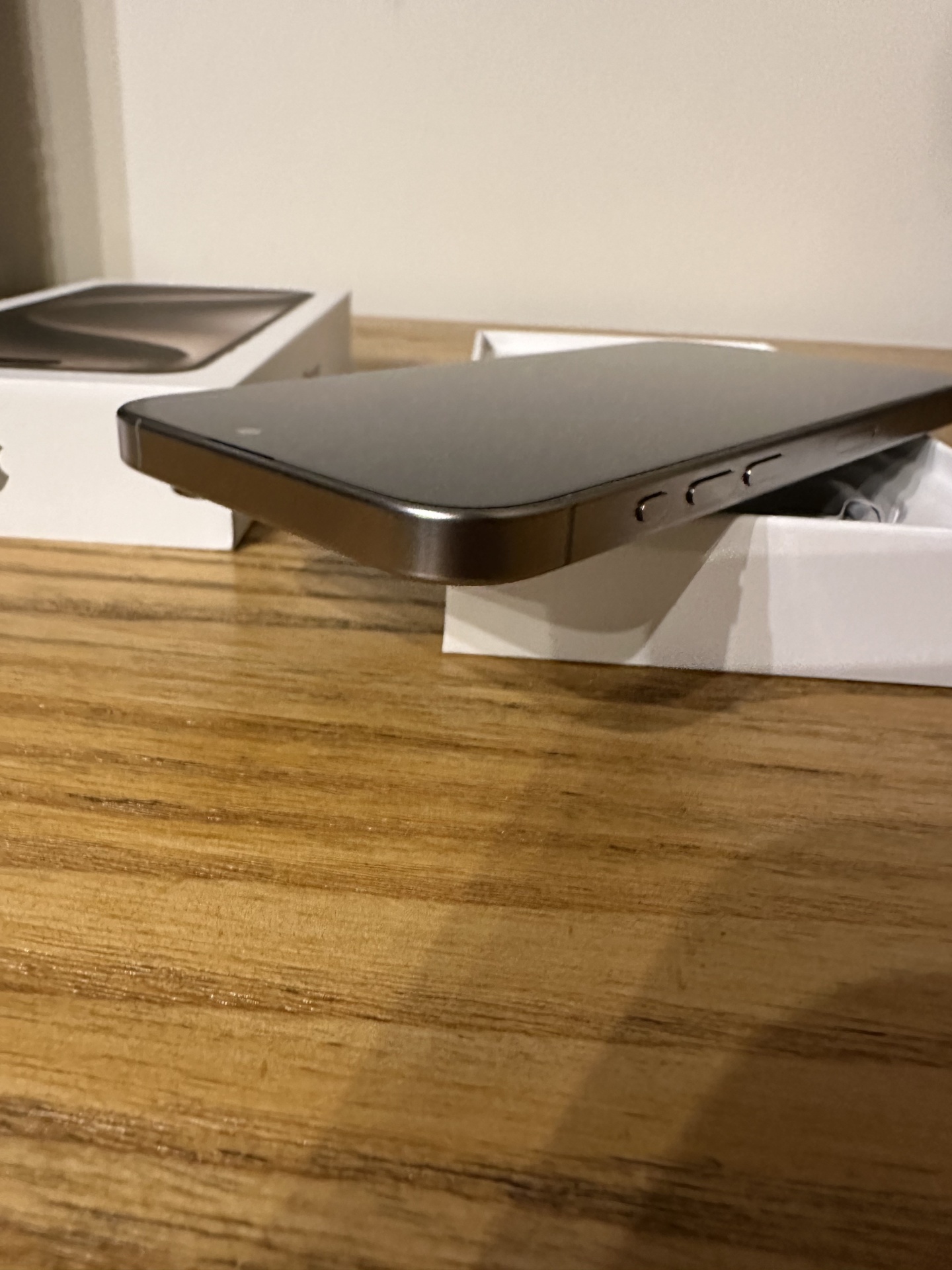• Smartphone prateado com caixa branca sobre mesa de madeira