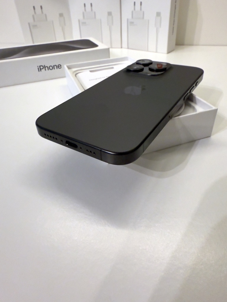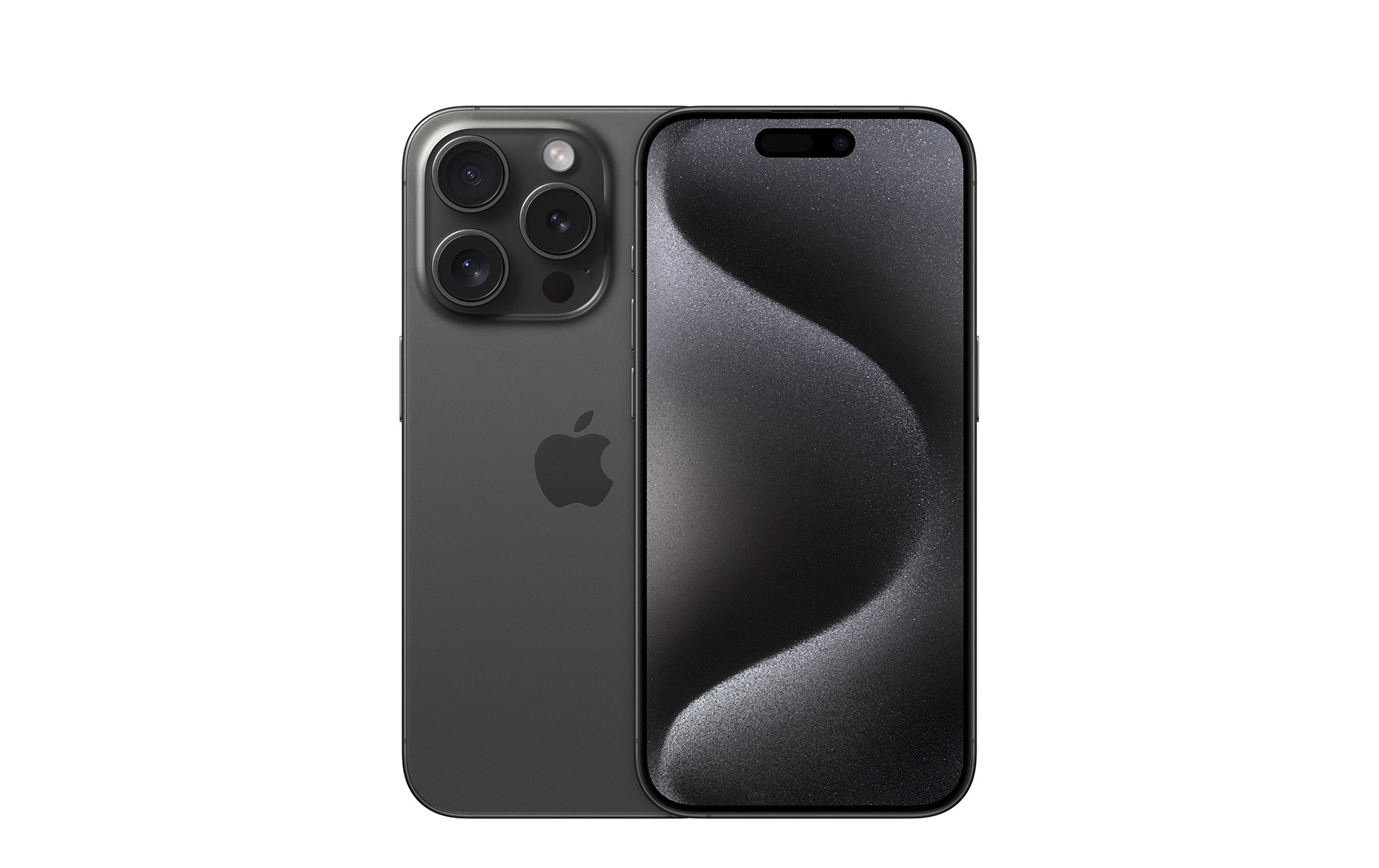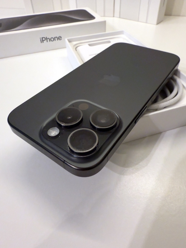 • iPhone preto com três câmeras numa caixa branca com texto 'iPhone'.