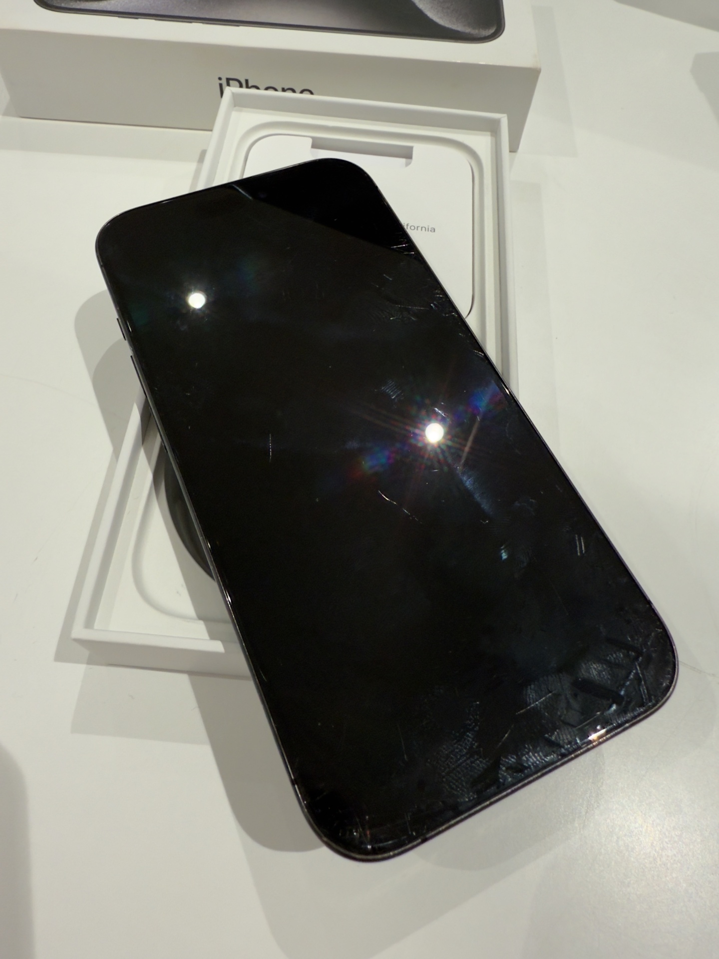 • Smartphone preto com ecrã riscado numa caixa branca com 'iPhone' no fundo