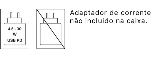 carrega até 50% em cerca de 30 minutos com o adaptador de 20 W ou superior e o cabo de carregamento USB‑C, ou com o adaptador de 30 W ou superior e o Carregador MagSafe (todos vendidos à parte)