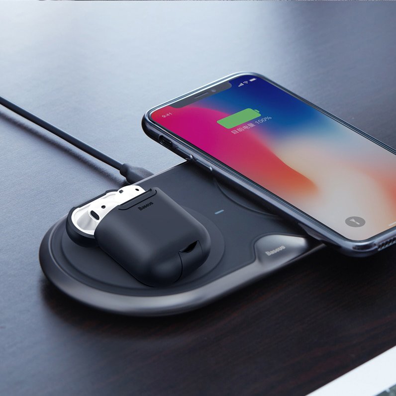 2 Tipos de carregamento: Poderá carregar os seus AirPods com ou sem fios. A capa tem uma abertura para que o carregamento também seja feito com fios. Sem fios, basta pousar os AirPods na sua base de carregamento Qi.