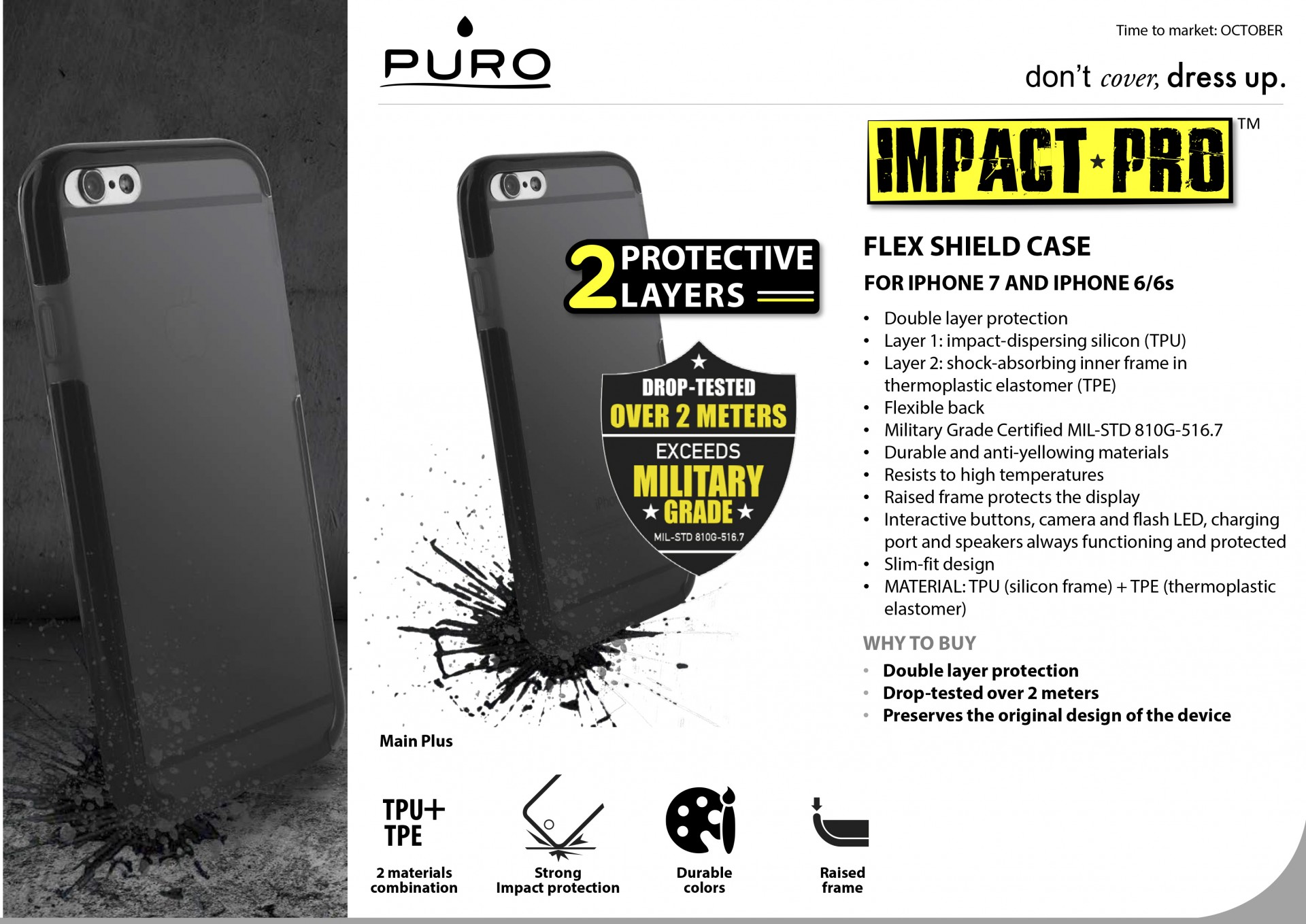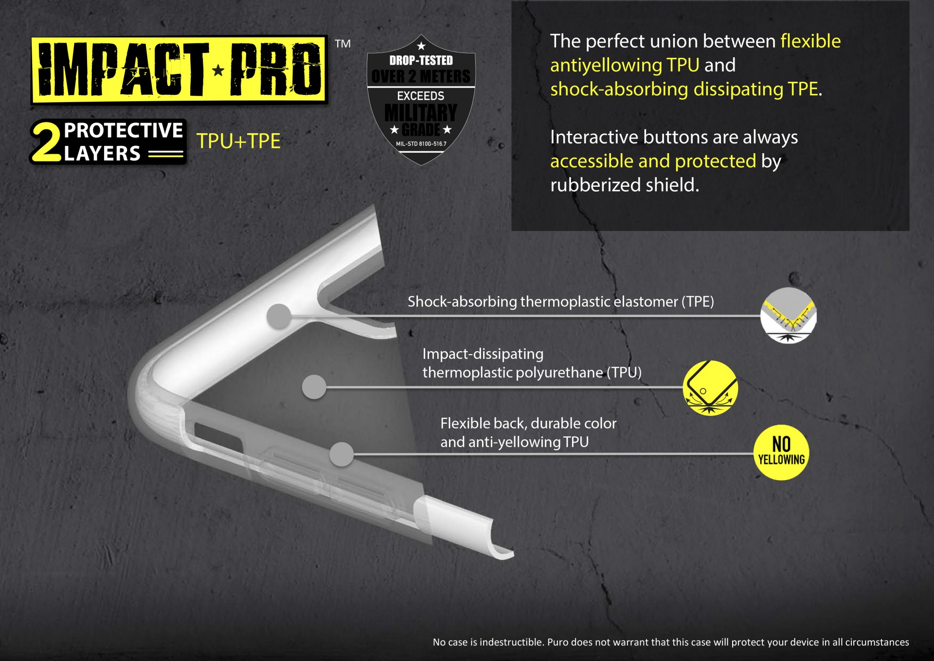 Em caso de impacto com o solo, a carcaça de múltiplas camadas absorve, rejeita e dispersa o choque aumentando o nível de segurança em seu dispositivo. As múltiplas camadas de TPE rígido e policarbonato absorvem a energia do choque, contribuindo juntos para proteger seu iPhone.