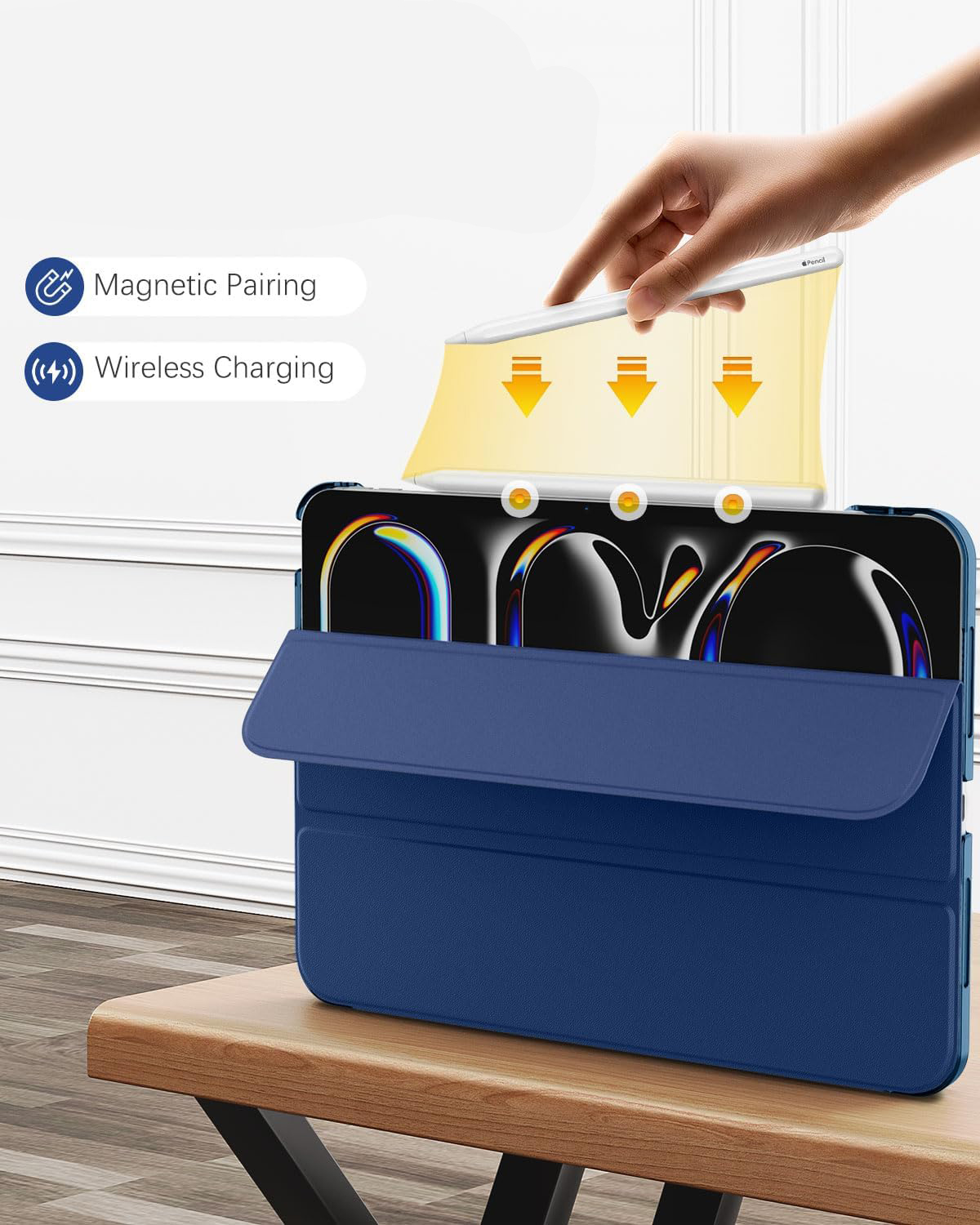 A abertura lateral permite que a Apple Pencil seja fixada magneticamente ao iPad, garantindo emparelhamento e carregamento sem ter que remover a capa, com acesso total a todos os controlos e funcionalidades.