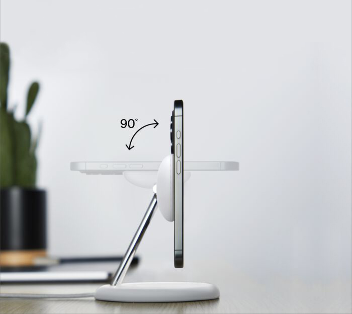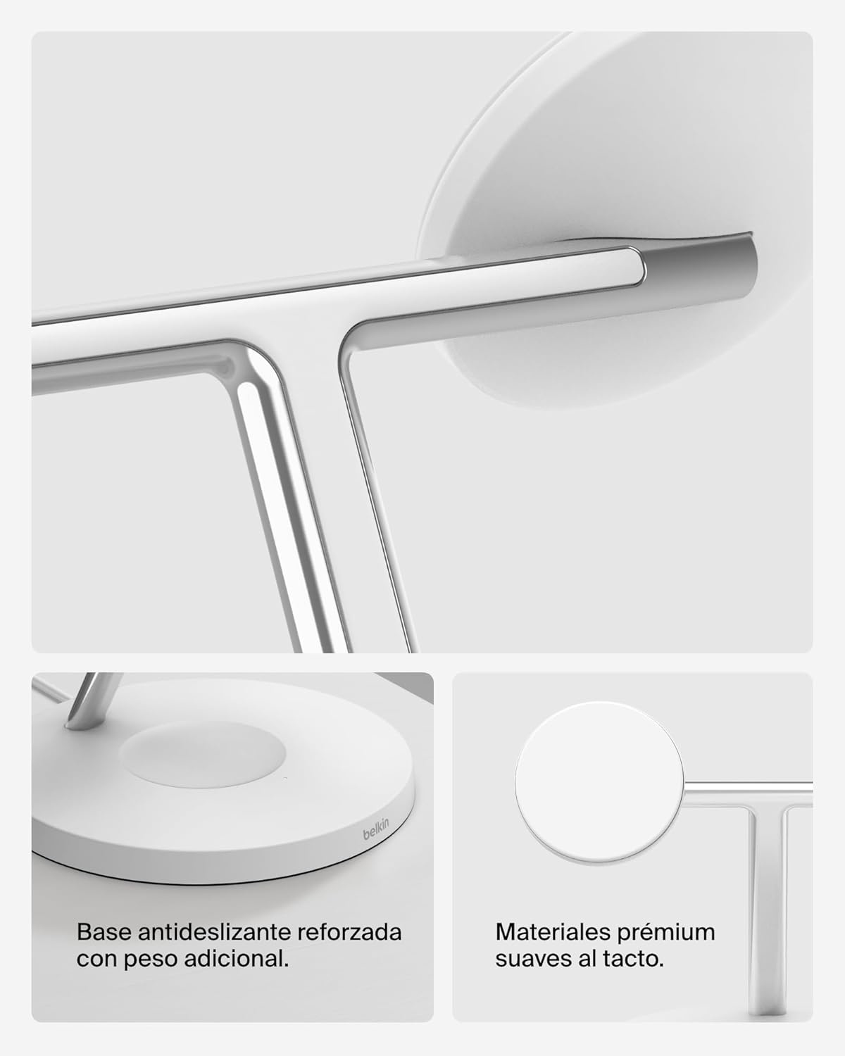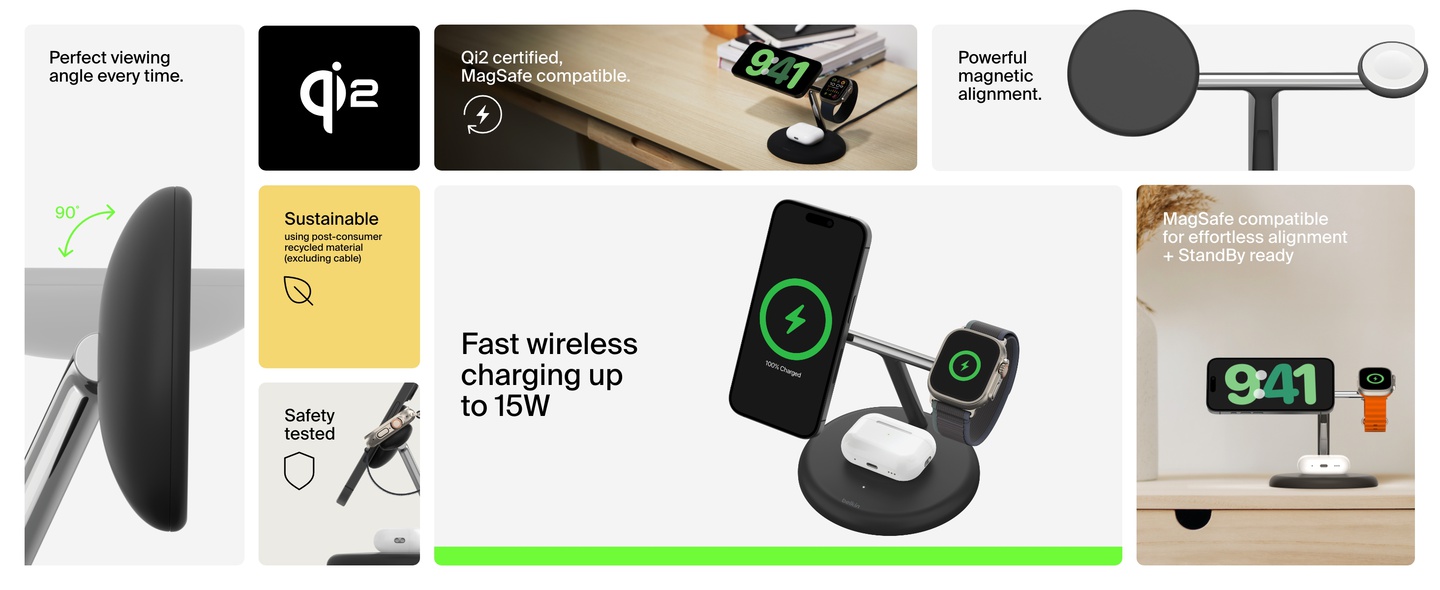 A nova geração do popular suporte 3 em 1, agora com compatibilidade Qi2, LED informativo e inclinação ajustável para o carregador MagSafe do iPhone e uma base mais pequena.
