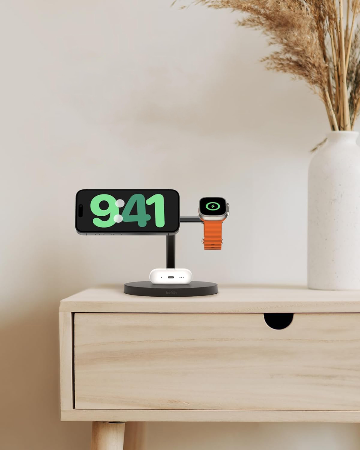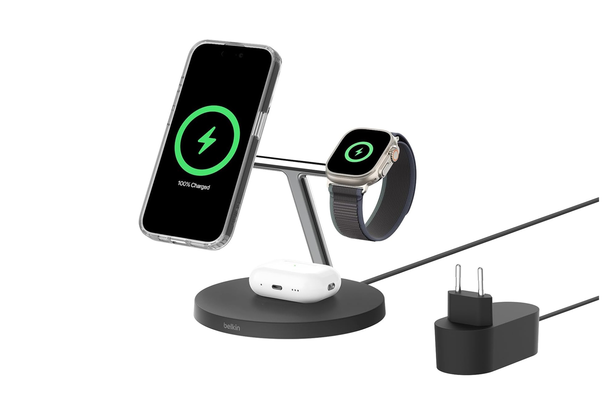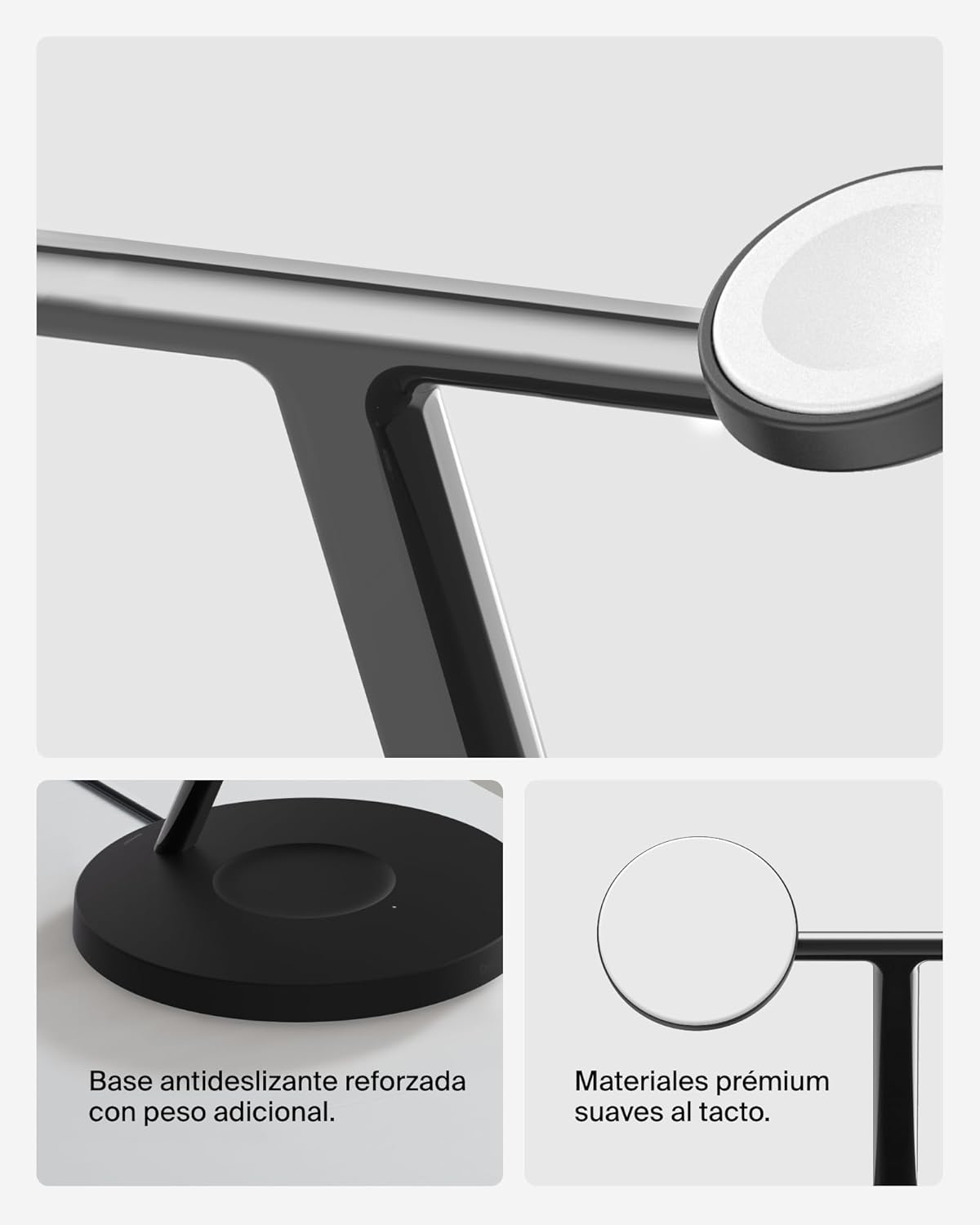 A nova geração do popular suporte 3 em 1, agora com compatibilidade Qi2, LED informativo e inclinação ajustável para o carregador MagSafe do iPhone e uma base mais pequena.