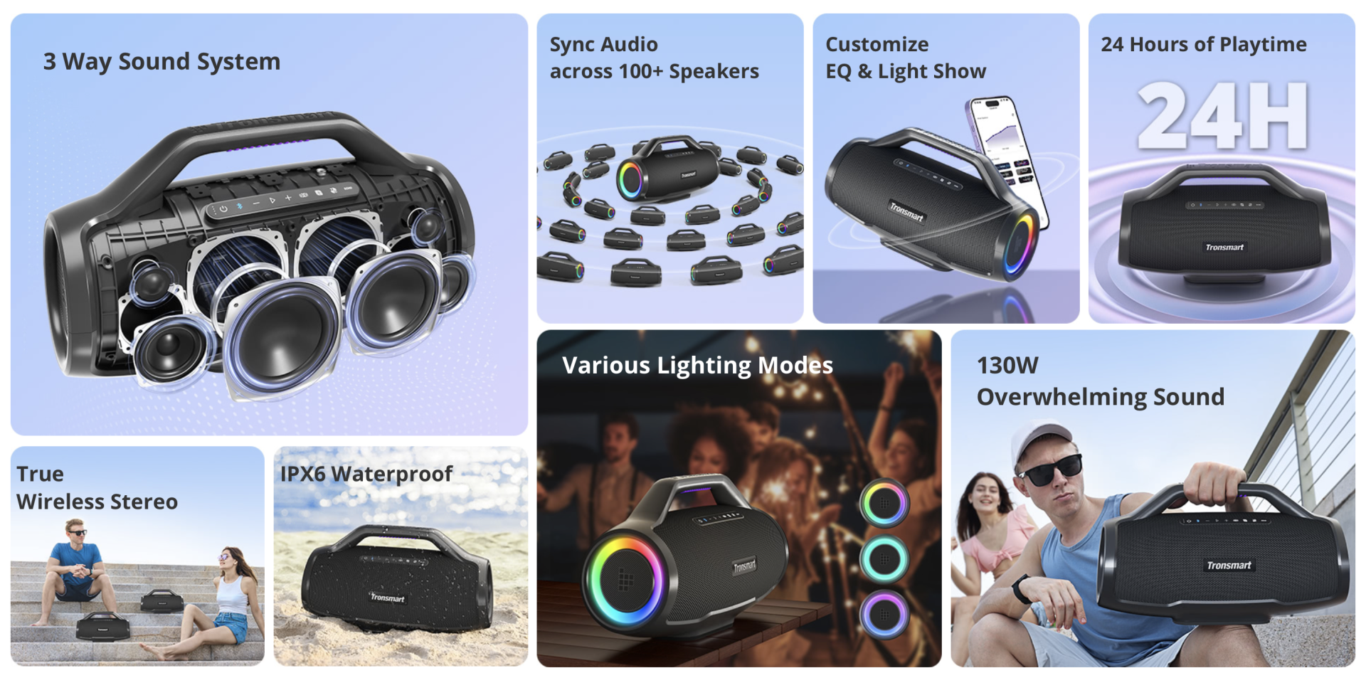 Equipado com tweeters duplos, altifalantes médios e woofers, o Bang Max oferece um som potente de 130W. Desfruta de graves intensos, médios equilibrados e agudos nítidos, com maior amplitude sonora e elevada clareza.