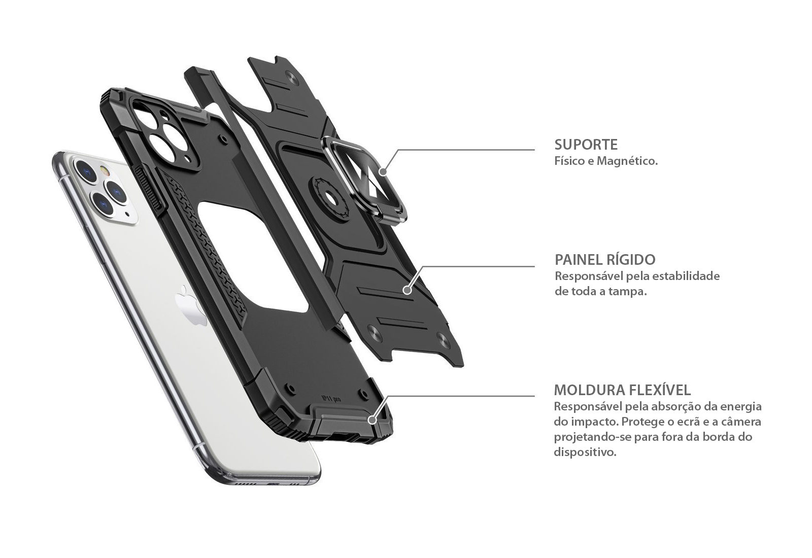 Alça de anel embutida: A parte de trás da capa possui uma alça integrada extremamente prática - Ring- que pode ser colocada no dedo para segurar o telefone com mais segurança em sua mão. Também permite que você prenda o iPhone a um suporte magnético para carro.