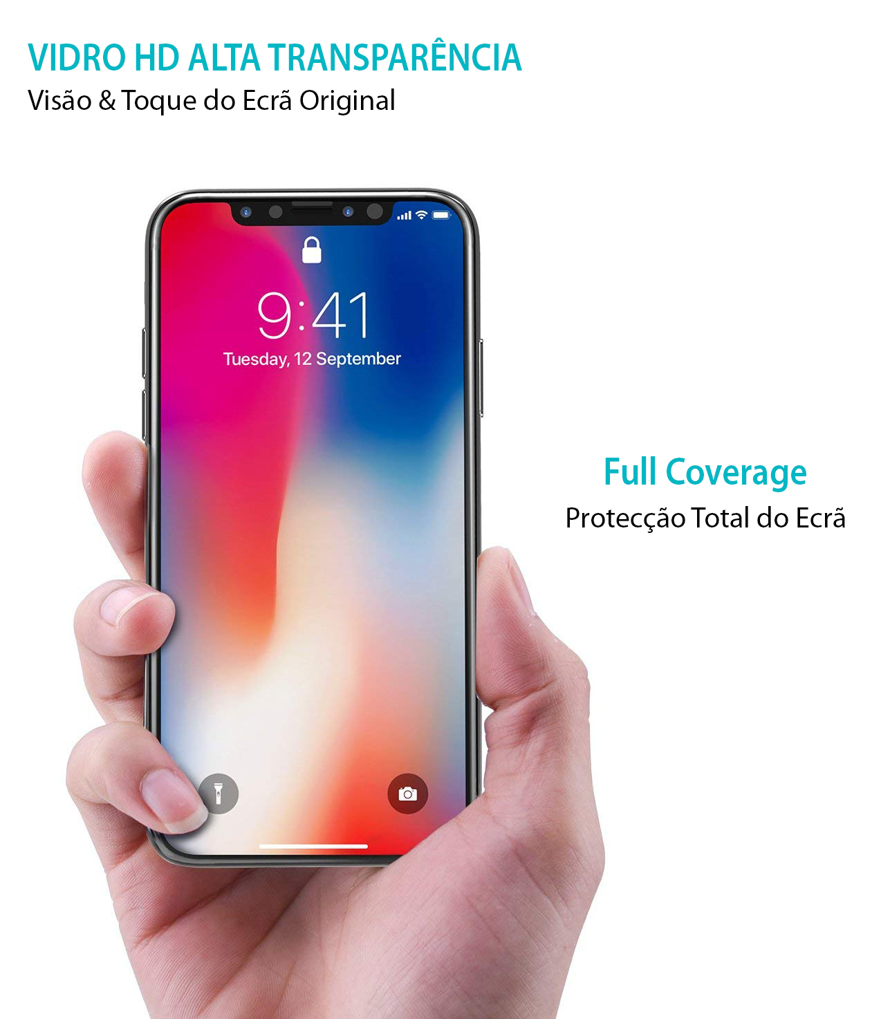 Este modelo 5D Full Coverage tapa o ecrã do iPhone na totalidade, ficando protegido mesmo nas extremidades.