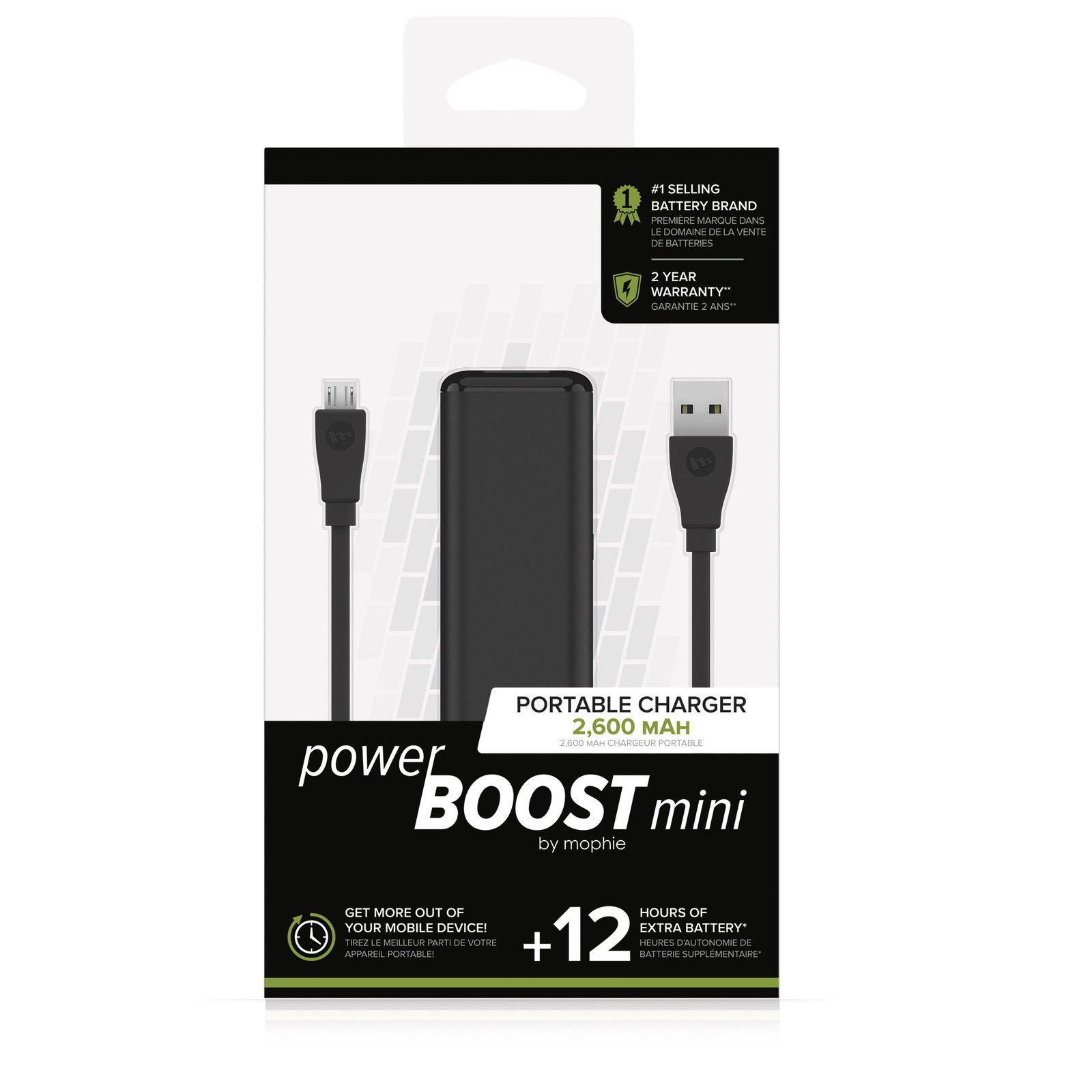 Bateria externa com capacidade de 2600mAh. Acrescente até mais 12 horas de bateria extra com esta elegante Power Bank Mophie Boost Mini, de design compacto.