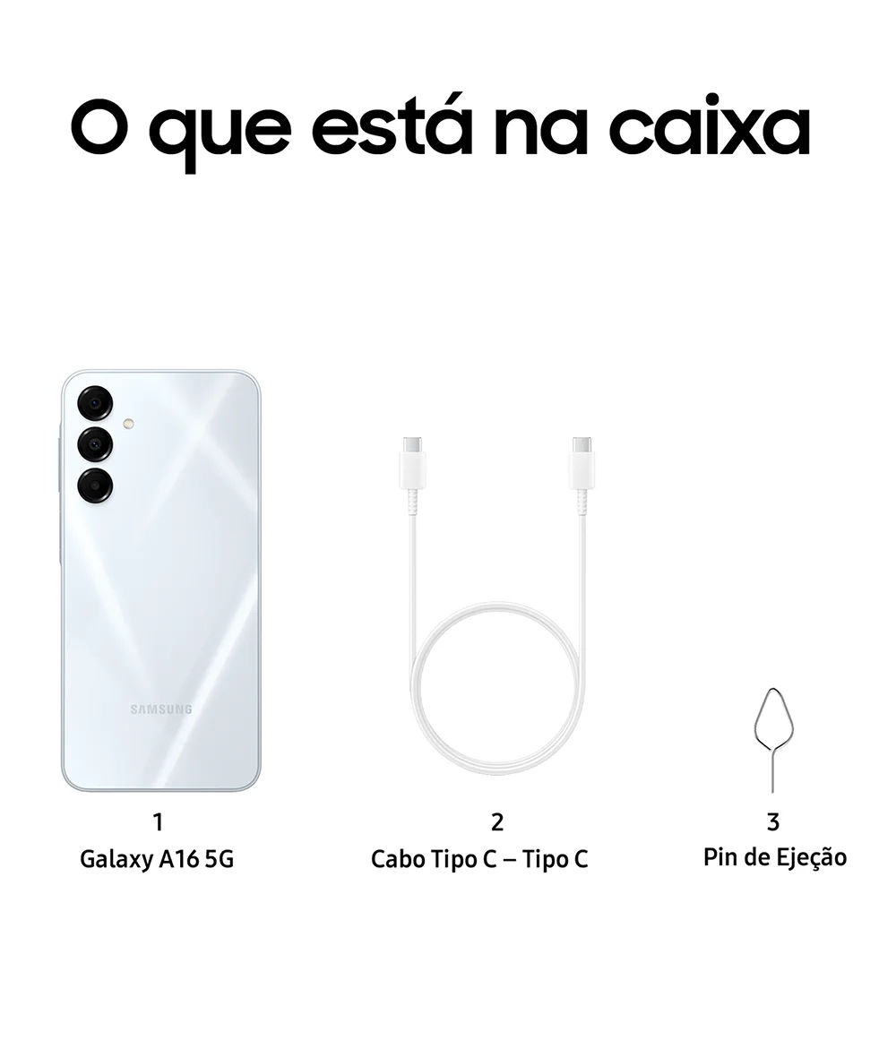 • Conteúdo da caixa Galaxy A16 5G com telefone branco, cabo tipo C e pin de ejeção.