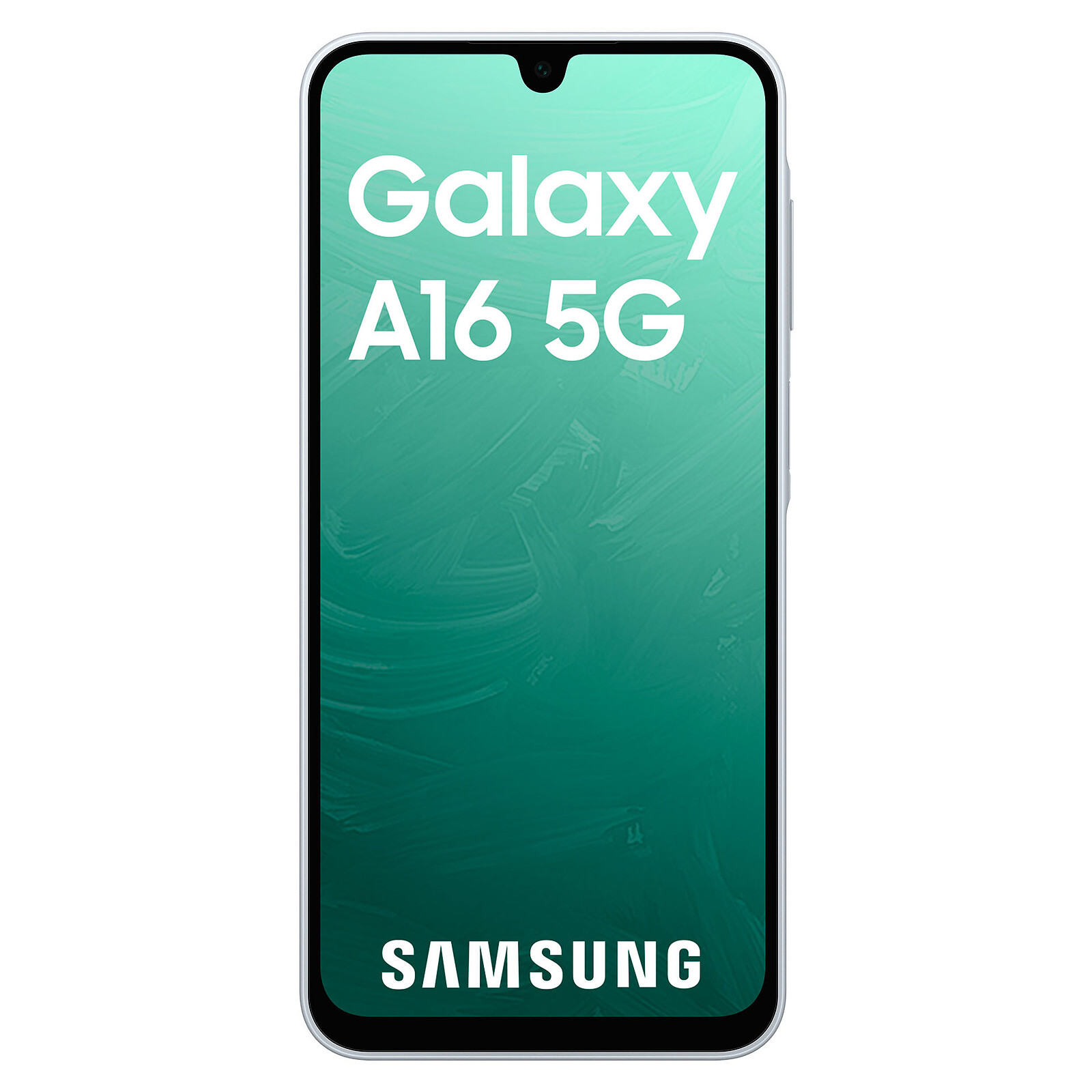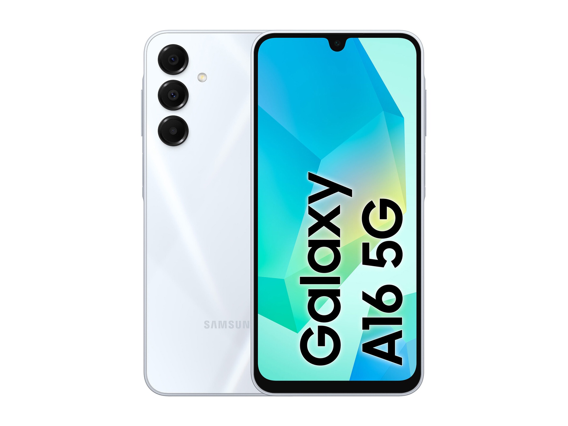 • Smartphone branco Samsung Galaxy A16 5G com ecrã ligado e três câmeras traseiras